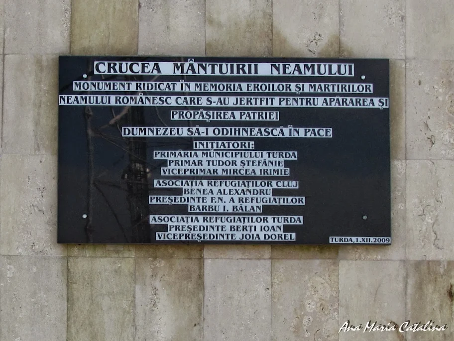 - "S-a ridicat acest monument in memoria tuturor eroilor, martirilor, refugiatilor, expulzatilor si deportatilor care "s-au petrecut ca floarea si frunza campului" pe meleagurile turdene, in timpul ocupatiei straine. Primaria si Consiliul Local Turda Asociatia Judeteana a Refugiatilor Cluj