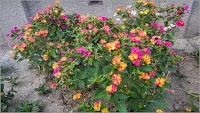 Noptiță (Mirabilis jalapa) pe Str. Macilor - "Frumoasele nopții” își deschid corolele portocalii și roșii, pictând spatiul verde în tonuri de apus.